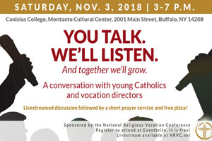 The National Religious Vocation Conference (NRVC) will be hosting an afternoon of dialogue with young adults at Canisius College in Buffalo, NY on Nov. 3, 2018 at 3 p.m. Easterm time on faith, decision-making, and what younger Catholics see as the gifts and challenges of the church. Youth groups, young adults, and vocation directors in the Buffalo area are welcome to attend, and all others can join in via a livestream broadcast. Continue reading